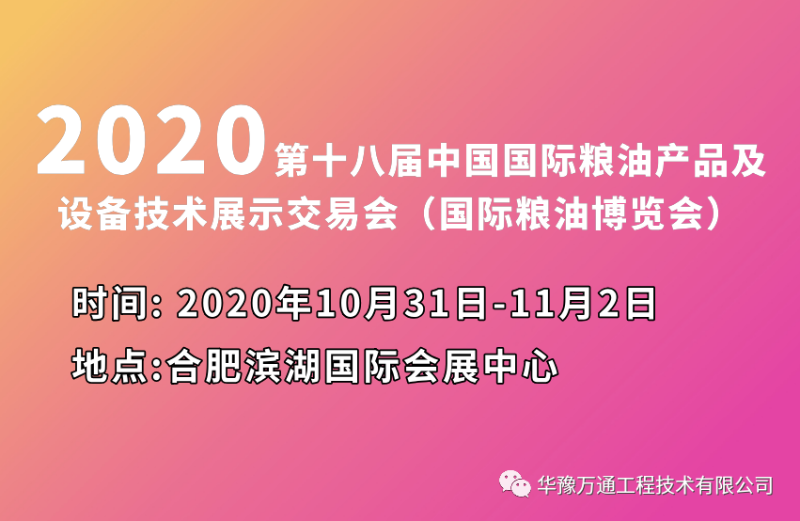 2020年10月31日,合肥濱湖國際會展中心,華豫萬通誠邀您蒞臨展位,了解華豫萬通新雜糧設(shè)備,探討雜糧加工工藝,共襄盛舉。華豫萬通作為糧機(jī)設(shè)備展區(qū)重點(diǎn)企業(yè),本次將攜帶多款新研發(fā)設(shè)備亮相展會。