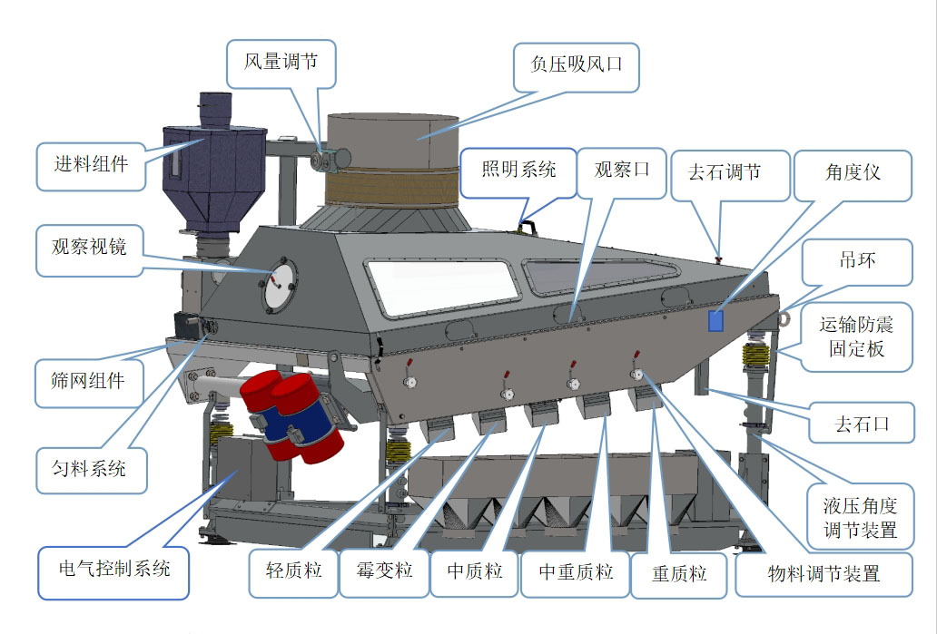 3.出料端設(shè)計六級比重不同的物料出口,可有效分離出石子、重質(zhì)粒、中重質(zhì)粒、中質(zhì)粒、霉變粒、輕質(zhì)粒。